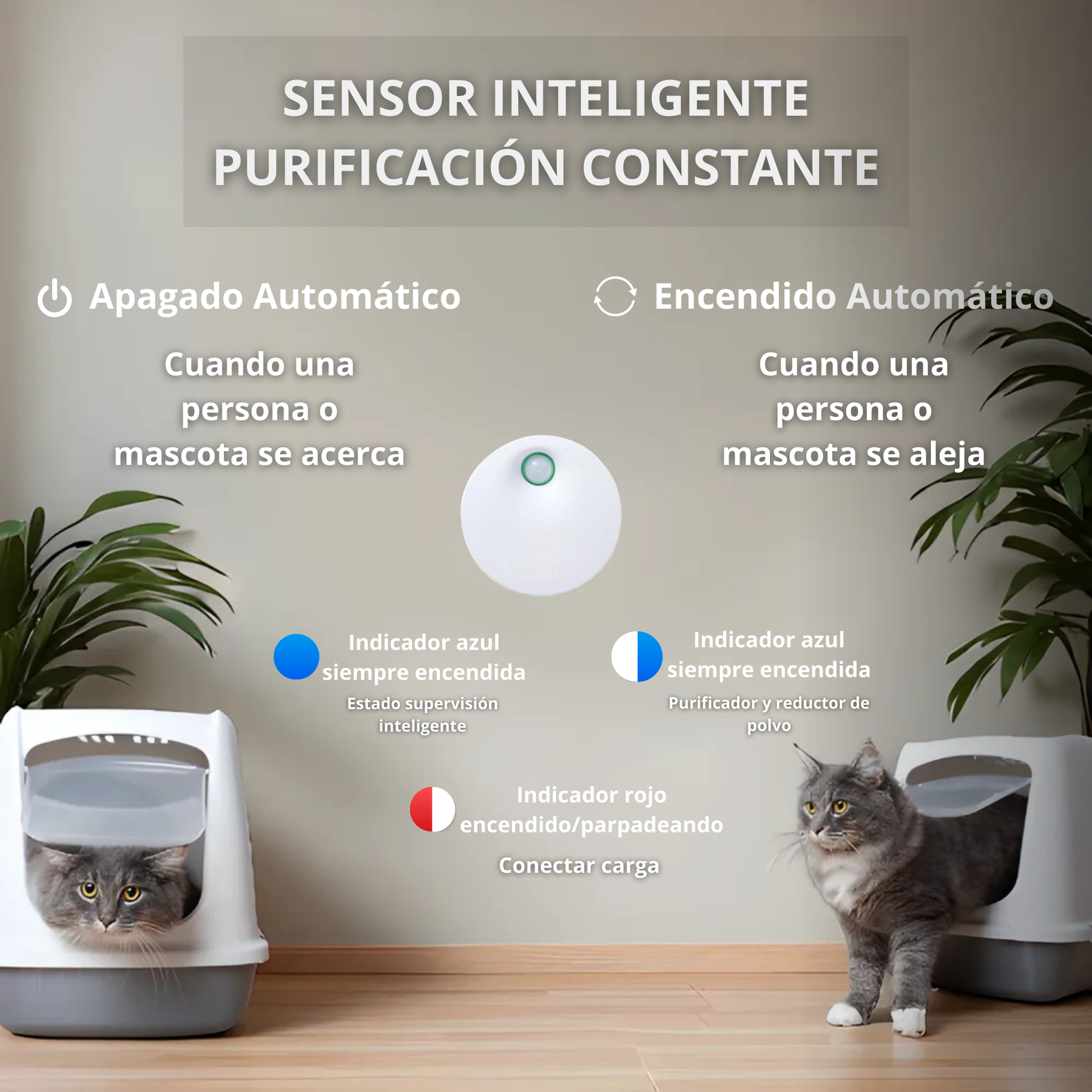 - Purificación inteligente y 24/7: Su modo de supervisión inteligente detecta la presencia de tu mascota, activándose automáticamente cuando se acerca y se apaga cuando se aleja. ¡Funciona por sí solo!
